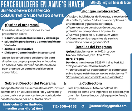 Peacebuilders is a high school community service program that will introduce high school students to peacebuilding while giving them the opportunity to strengthen their leadership and teamwork skills by collaborating with their peers to create and implement community service projects.